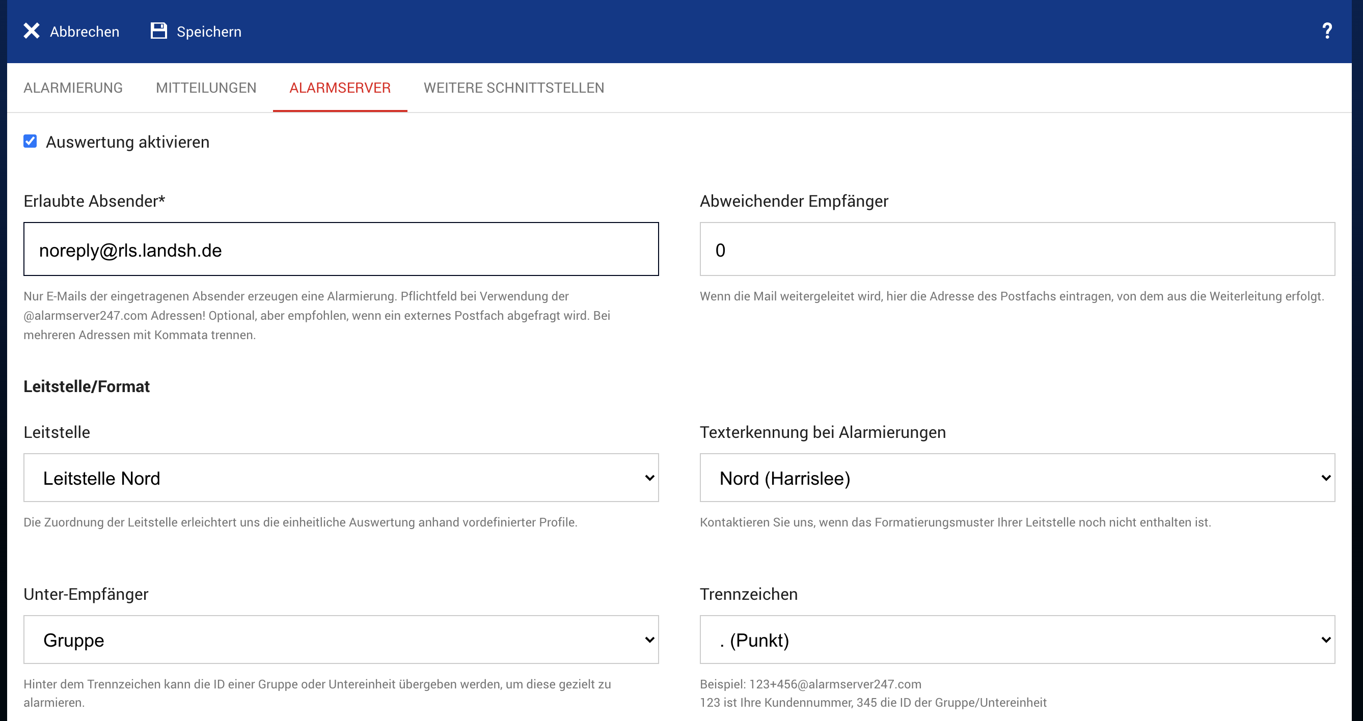 Die Auswertung wird aktiviert. Die Absenderadresse für die Leitstelle Nord ist noreply@rls.landsh.de und muss unbedingt eingetragen werden. Weitere Adressen, z.B. um als Wehrführer*in per Email Alarmierungen auszulösen, werden hier durch Kommata getrennt angehängt. Wenn die Emails von der Leitstelle an ein eigenes Postfach gesendet und von dort zu Divera umgeleitet werden sollen, muss die Postfachadresse unter Abweichender Empfänger eingetragen werden. Unter Leistelle/Format ist als Leitstelle die Leitstelle Nord und als Texterkennung Nord (Harrislee) auszuwählen.