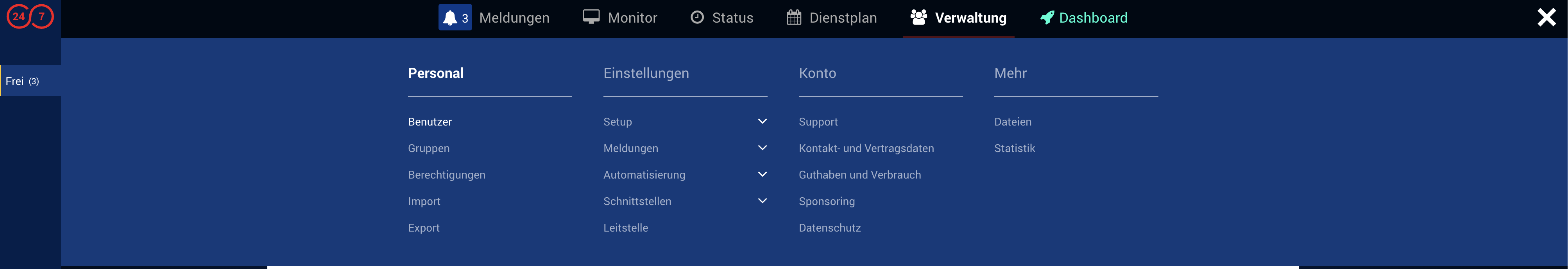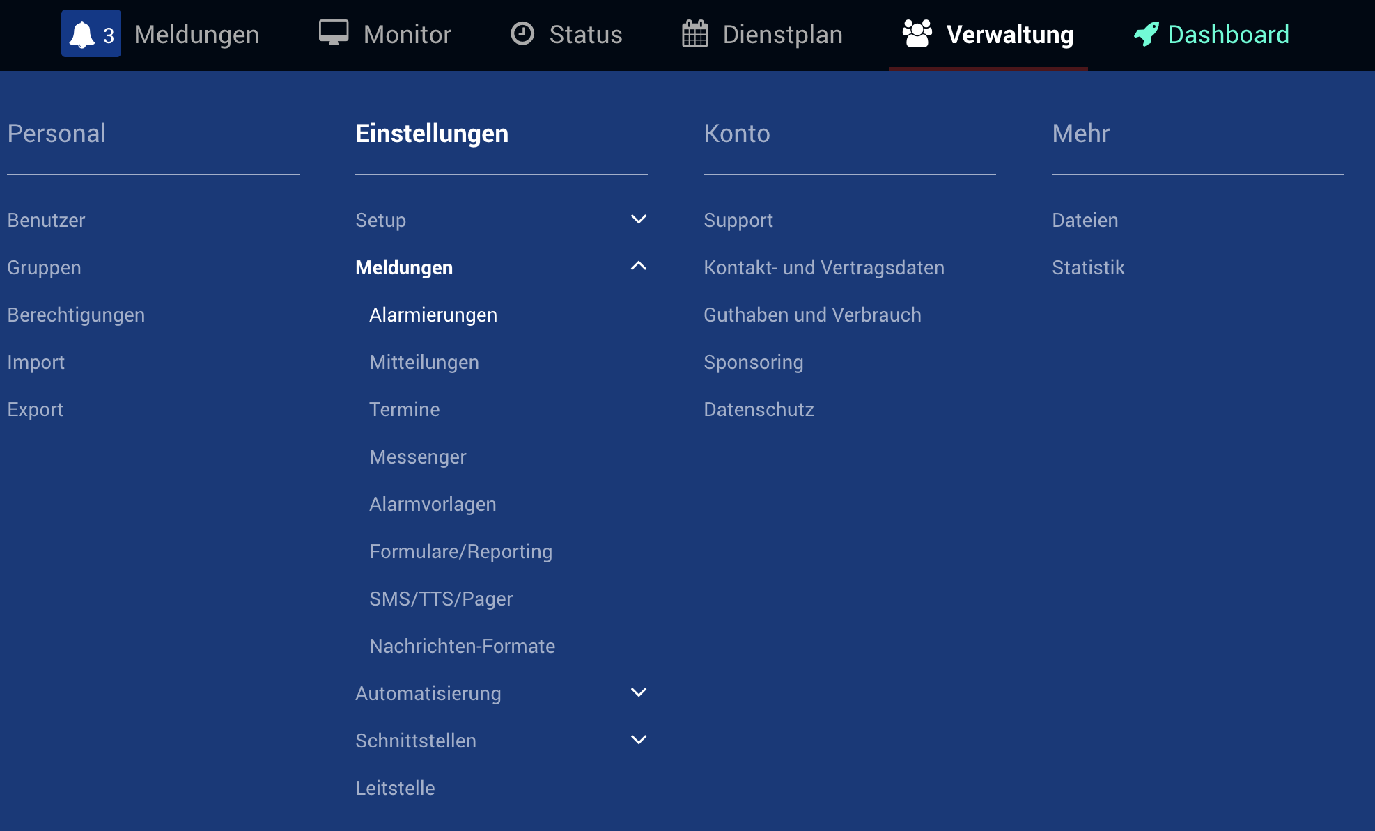 Zur Einrichtung der Auswertung der Alarmdepesche zur Alarmierung muss oben auf Verwaltung, dann auf den Pfeil nach unten neben Schnittstellen und dann auf Alarmserver geklickt werden.
