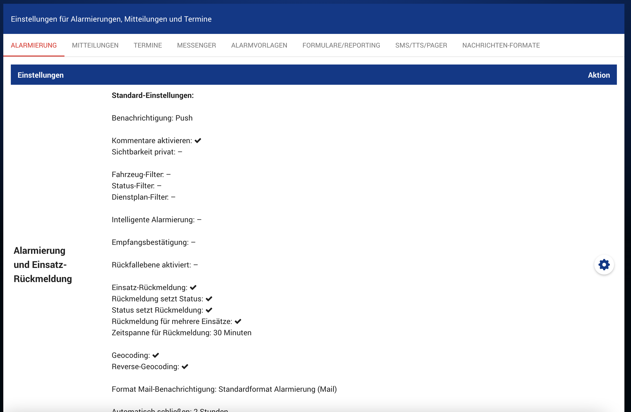 Auf der geöffneten Seite ist eine Übersicht der wichtigsten Einstellungen zu sehen. Um Einstellungen vorzunehmen, muss auf das Zahnrad geklickt werden.